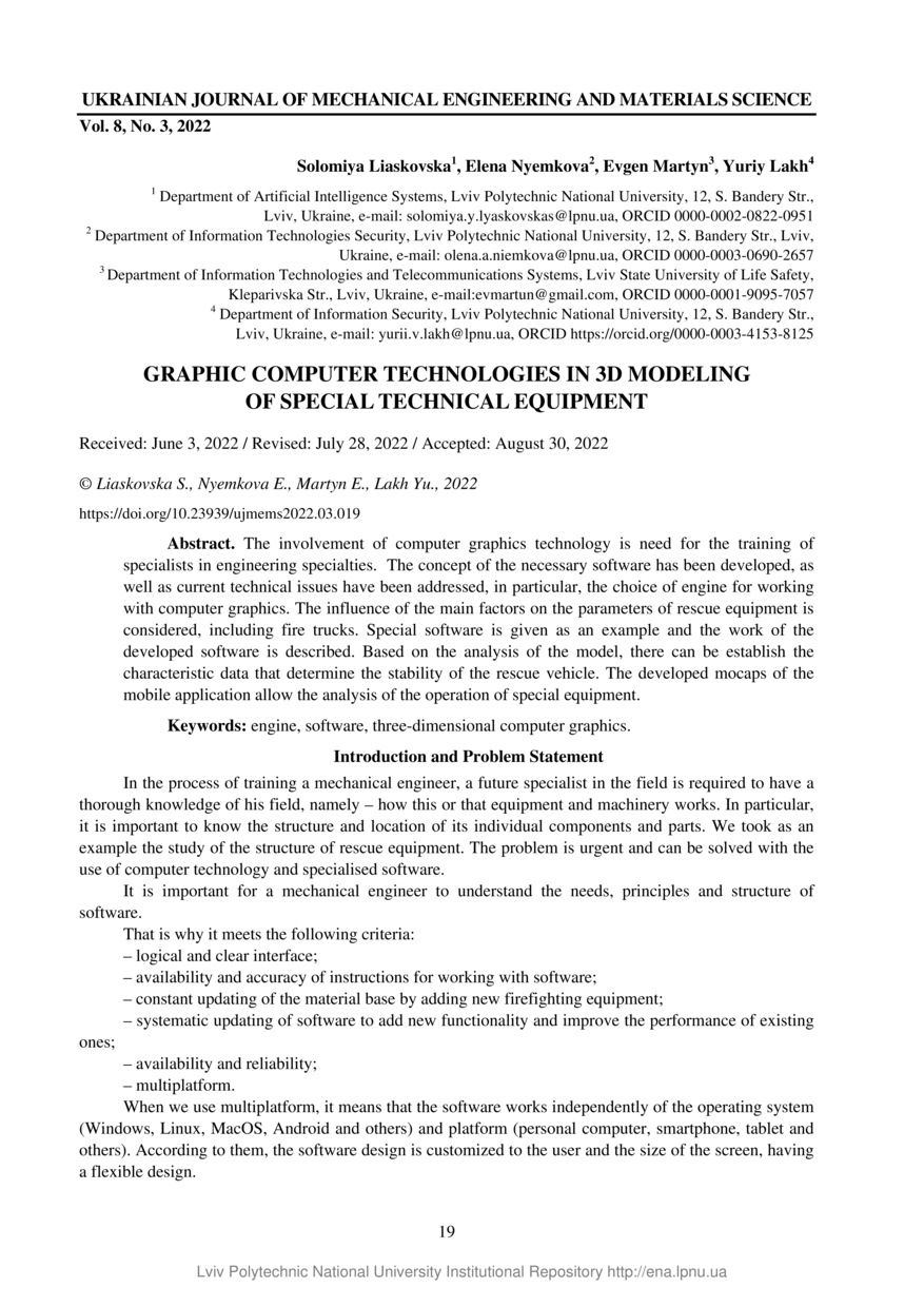 | dc.identifier.citation | Graphic computer technologies in 3D modeling of special technical equipment / Solomiya Liaskovska, Elena Nyemkova, Evgen Martyn, Yuriy Lakh // Ukrainian Journal of Mechanical Engineering and Materials Science. — Lviv : Lviv Politechnic Publishing House, 2022. — Vol 8. — No 3. — P. 19–24. | |
