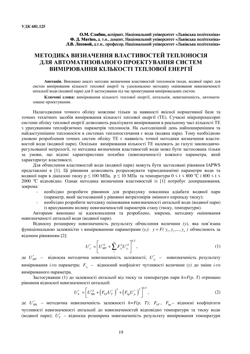 Слабик О. М. Методика визначення властивостей теплоносія для автоматизованого проектування систем вимірювання кількості теплової енергії / О. М. Слабик, Ф. Д. Матіко, Л. В. Лесовой // Автоматика/Automatiсs – 2018 : матеріали XXV Міжнародної конференція з автоматичного управління, 18–19 вересня 2018 року, Львів. — Львів : Видавництво Львівської політехніки, 2018. — С. 19–20. — (Управління та ідентифікація в умовах невизначенності).