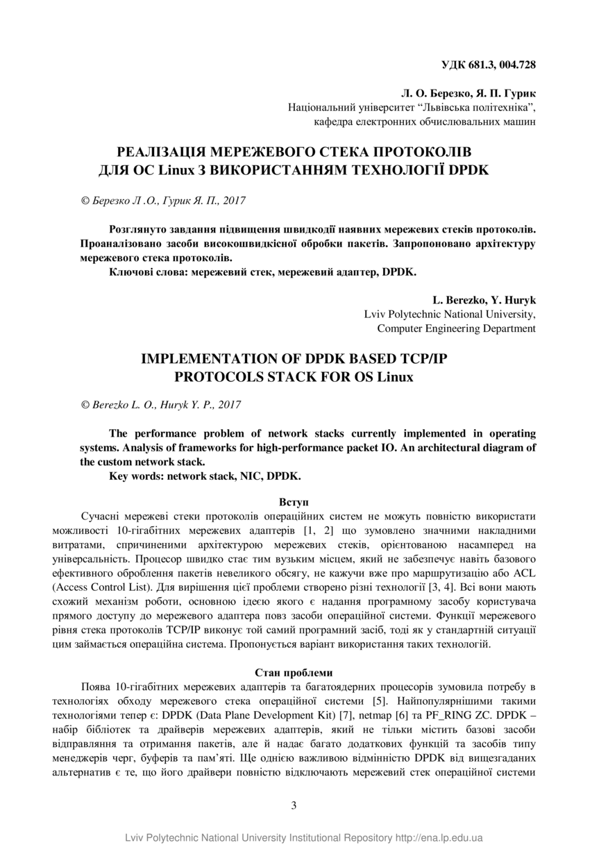 Березко Л. О. Реалізація мережевого стека протоколів для ОС Linux з використанням технології DPDK / Л. О. Березко, Я. П. Гурик // Вісник Національного університету «Львівська політехніка». Серія: Комп’ютерні системи та мережі. — Львів : Видавництво Львівської політехніки, 2017. — № 881. — С. 3–6.