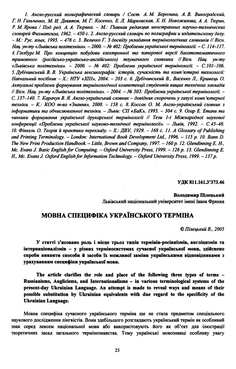 Пілецький В. Мовна специфіка українського терміна / Володимир Пілецький // Вісник Національного університету “Львівська політехніка”. — Львів : Видавництво Національного університету “Львівська політехніка”, 2005. — № 538 : Проблеми української термінології. — С. 25–32. — (Теоретичні засади термінознавства та лексикографії).