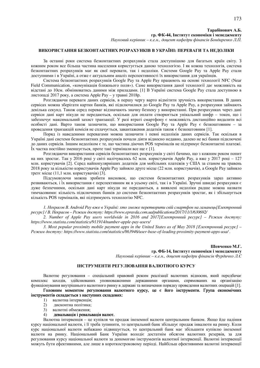 Тарабінович А. Б. Використання безконтактних розрахунків в Україні: переваги та недоліки / А. Б. Тарабінович, Л. П. Бондаренко // 76-та Студентська науково-технічна конференція. Секція "Економіка і менеджмент" : збірник тез доповідей, жовтень – листопад 2018 року. — Львів : Видавництво Львівської політехніки, 2018. — С. 173. — (Проблеми розвитку фінансового ринку).