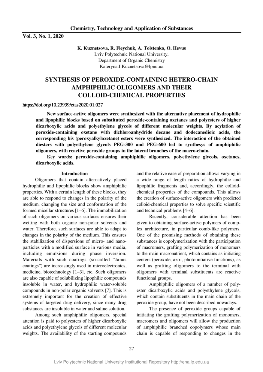 Synthesis of peroxid-containing hetero-chain amphiphilic oligomers and their colloid-chemical properties / K. Kuznetsova, R. Fleychuk, A. Tolstenko, O. Hevus // Chemistry, Technology and Application of Substances. — Lviv : Lviv Politechnic Publishing House, 2020. — Том 3. — № 1. — С. 27–32.