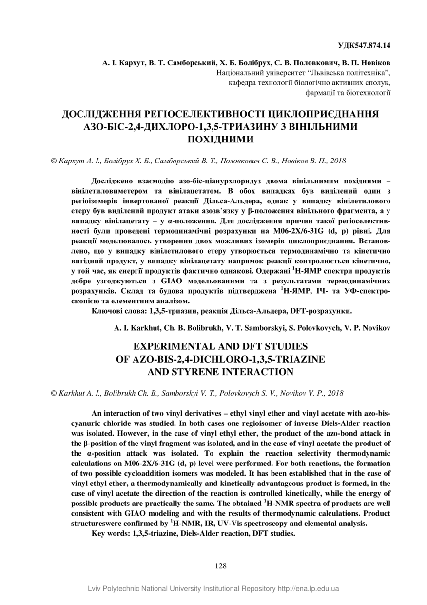 Дослідження регіоселективності циклоприєднання азо-біс-2,4-дихлоро-1,3,5-триазину 3 вінільними похідними / А. І. Кархут, В. Т. Самборський, Х. Б. Болібрух, С. В. Половкович, В. П. Новіков // Вісник національного університету “Львівська політехніка”. Серія: Хімія, технологія речовин та їх застосування. — Львів : Видавництво Львівської політехніки, 2018. — № 886. — С. 128–135. — (Технологія бродіння, біотехнологія та фармація).
