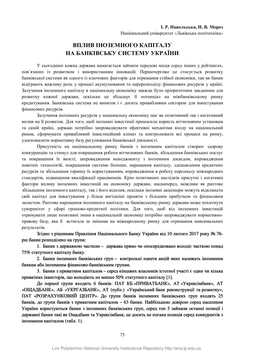 Навольська І. Р. Вплив іноземного капіталу на банківську систему України / І. Р. Навольська, Н. В. Мороз // Фінансовий ринок: інституції та інструменти, 3–6 червня 2018 року, Львів. — Львів : Видавництво Львівської політехніки, 2018. — С. 75–76.