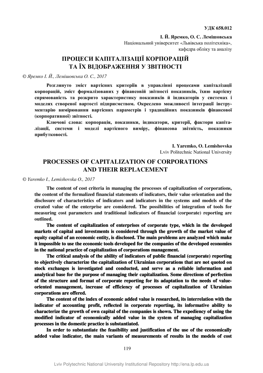 | dc.identifier.citation | Яремко І. Й. Процеси капіталізації корпорацій та їх відображення у звітності / І. Й. Яремко, О. С. Лемішовська // Вісник Національного університету «Львівська політехніка». Серія: Проблеми економіки та управління. — Львів : Видавництво Львівської політехніки, 2017. — № 873. — С. 119–125. | |