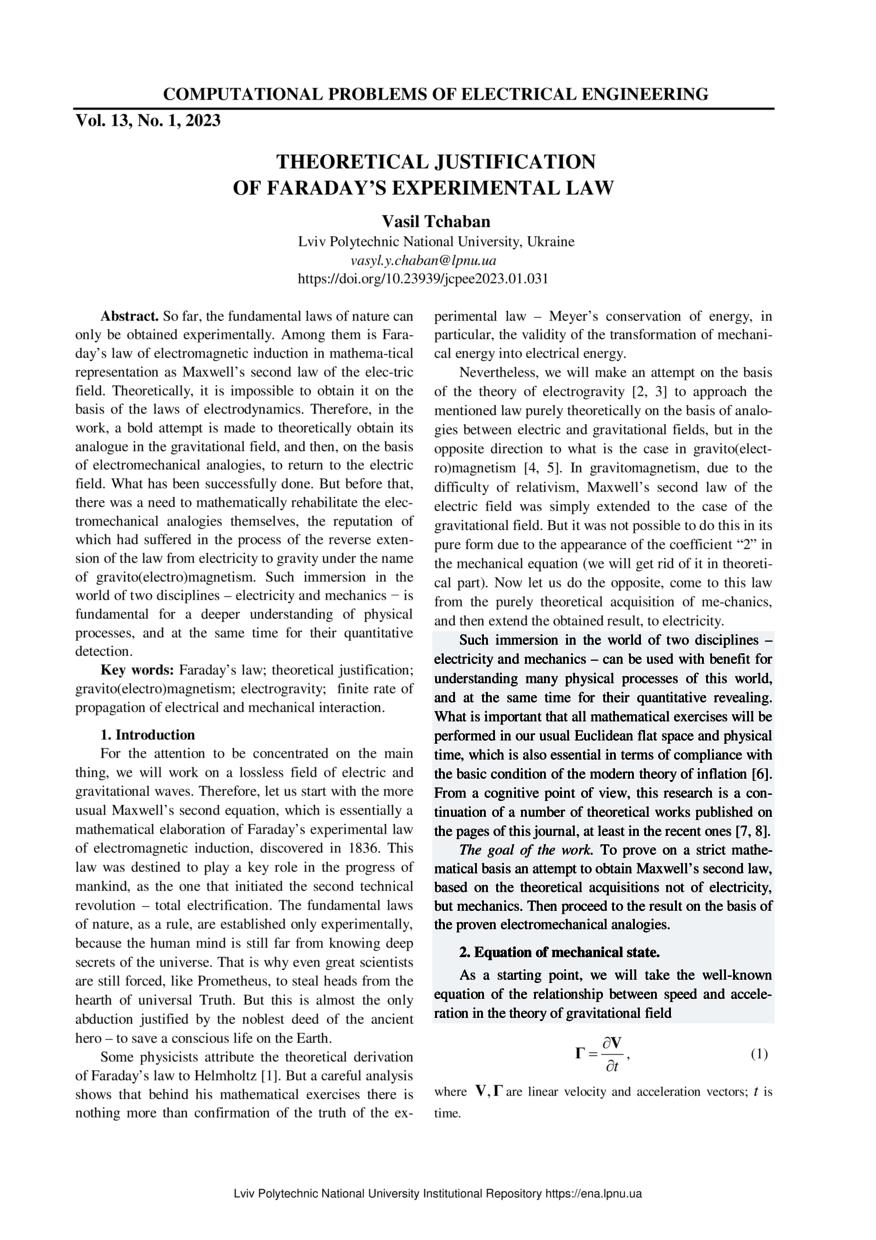 Чабан В. Теоретичне обґрунтування експериментального закону Фарадея / Василь Чабан // Обчислювальні проблеми електротехніки. — Львів : Видавництво Львівської політехніки, 2023. — Том 13. — № 1. — С. 31–34.