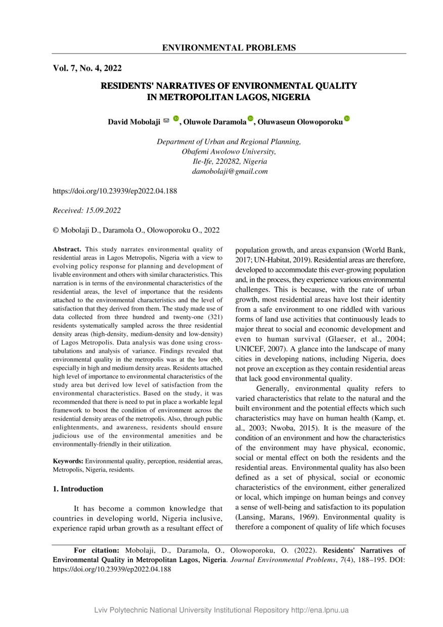 Mobolaji D. Residents’ Narratives of Environmental Quality in Metropolitan Lagos, Nigeria / David Mobolaji, Oluwole Daramola, Oluwaseun Olowoporoku // Environmental Problems. — Lviv : Lviv Politechnic Publishing House, 2022. — Vol 7. — No 4. — P. 188–195.