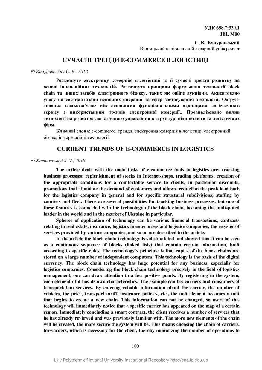 Качуровський С. В. Сучасні тренди e-commerce в логістиці / С. В. Качуровський // Вісник Національного університету “Львівська політехніка”. Серія: Логістика. — Львів : Видавництво Львівської політехніки, 2018. — № 892. — С. 100–104.