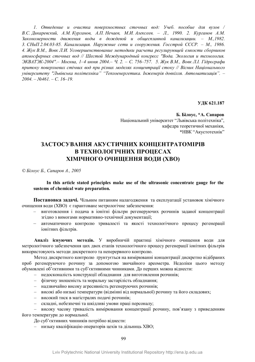 | dc.identifier.citation | Білоус Б. Застосування акустичних концентратомірівв технологічних процесах хімічного очищення води (ХВО) / Б. Білоус, А. Сапаров // Вісник Національного університету “Львівська політехніка”. — Львів : Видавництво Національного університету “Львівська політехніка”, 2005. — № 537 : Теплоенергетика. Інженерія довкілля. Автоматизація. — С. 99–102. | |