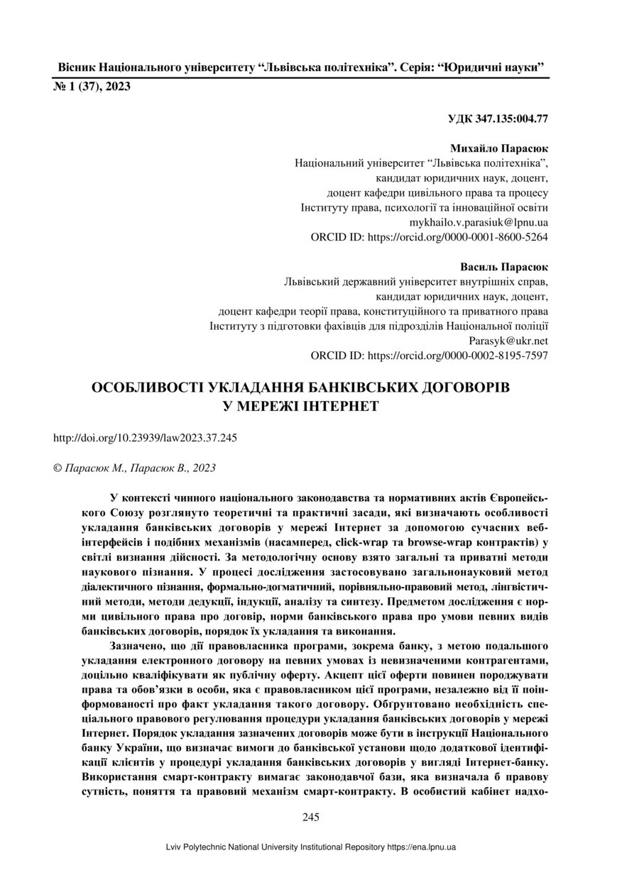 Парасюк М. Особливості укладання банківських договорів у мережі Інтернет / Михайло Парасюк, Василь Парасюк // Вісник Національного університету “Львівська політехніка”. Серія: Юридичні науки. — Львів : Видавництво Львівської політехніки, 2023. — № 1(37). — С. 245–252.