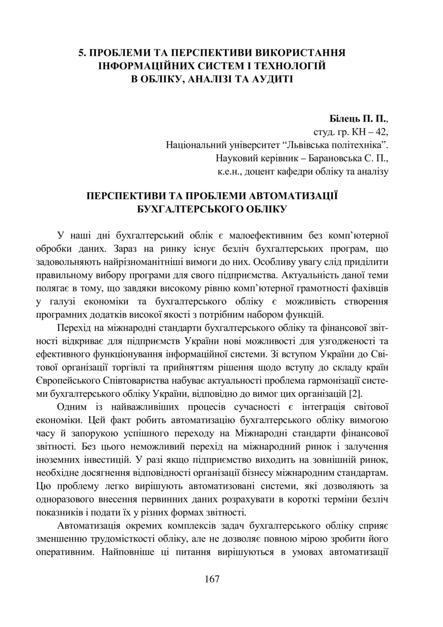 Білець П. П. Перспективи та проблеми автоматизації бухгалтерського обліку / П. П. Білець, С. П. Барановська // Облік, аналіз і контроль в системі управління суб’єктами економіки : тези доповідей ІV Міжнародної студентської наукової конференції, 18–19 жовтня 2018 року, Львів. — Львів : Видавництво Львівської політехніки, 2018. — С. 167–168. — (Проблеми та перспективи використання інформаційних систем і технологій в обліку, аналізі та аудиті).