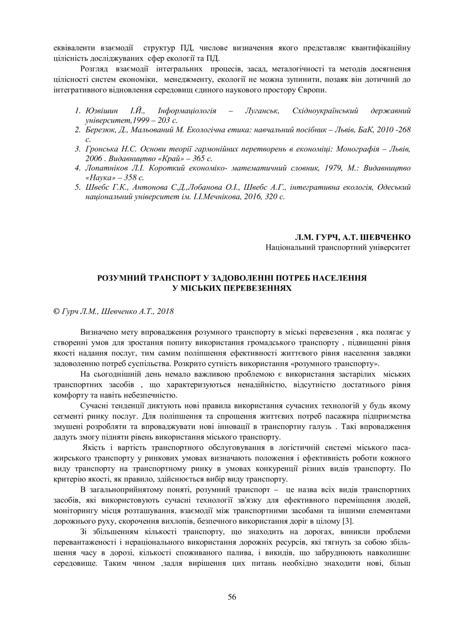 Гурч Л. М. Розумний транспорт у задоволенні потреб населення у міських перевезеннях / Л. М. Гурч, А. Т. Шевченко // Маркетинг та логістика в системі менеджменту : тези доповідей XІI Міжнародної науково-практичної конференції, 25–27 жовтня 2018 року, Львів. — Львів : Видавництво Львівської політехніки, 2018. — С. 56–57.