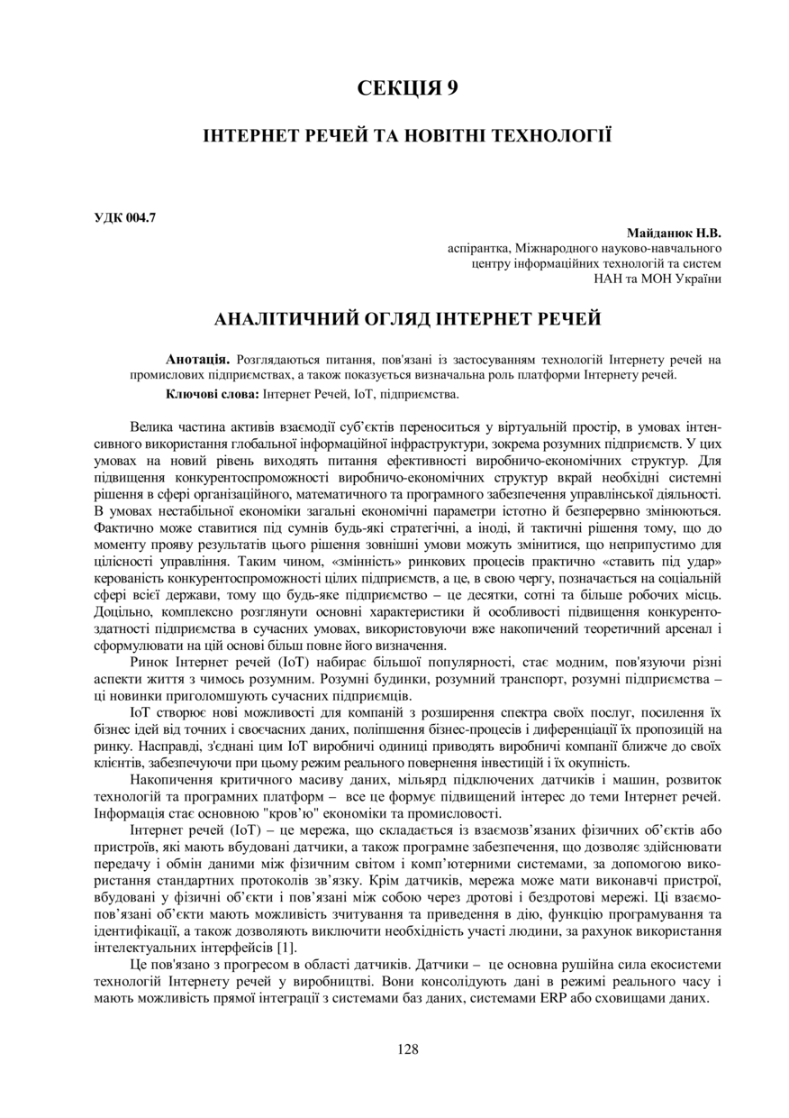 Майданюк Н. В. Аналітичний огляд Інтернет речей / Н. В. Майданюк // Автоматика/Automatiсs – 2018 : матеріали XXV Міжнародної конференція з автоматичного управління, 18–19 вересня 2018 року, Львів. — Львів : Видавництво Львівської політехніки, 2018. — С. 128–129. — (Інтернет речей та новітні технології).