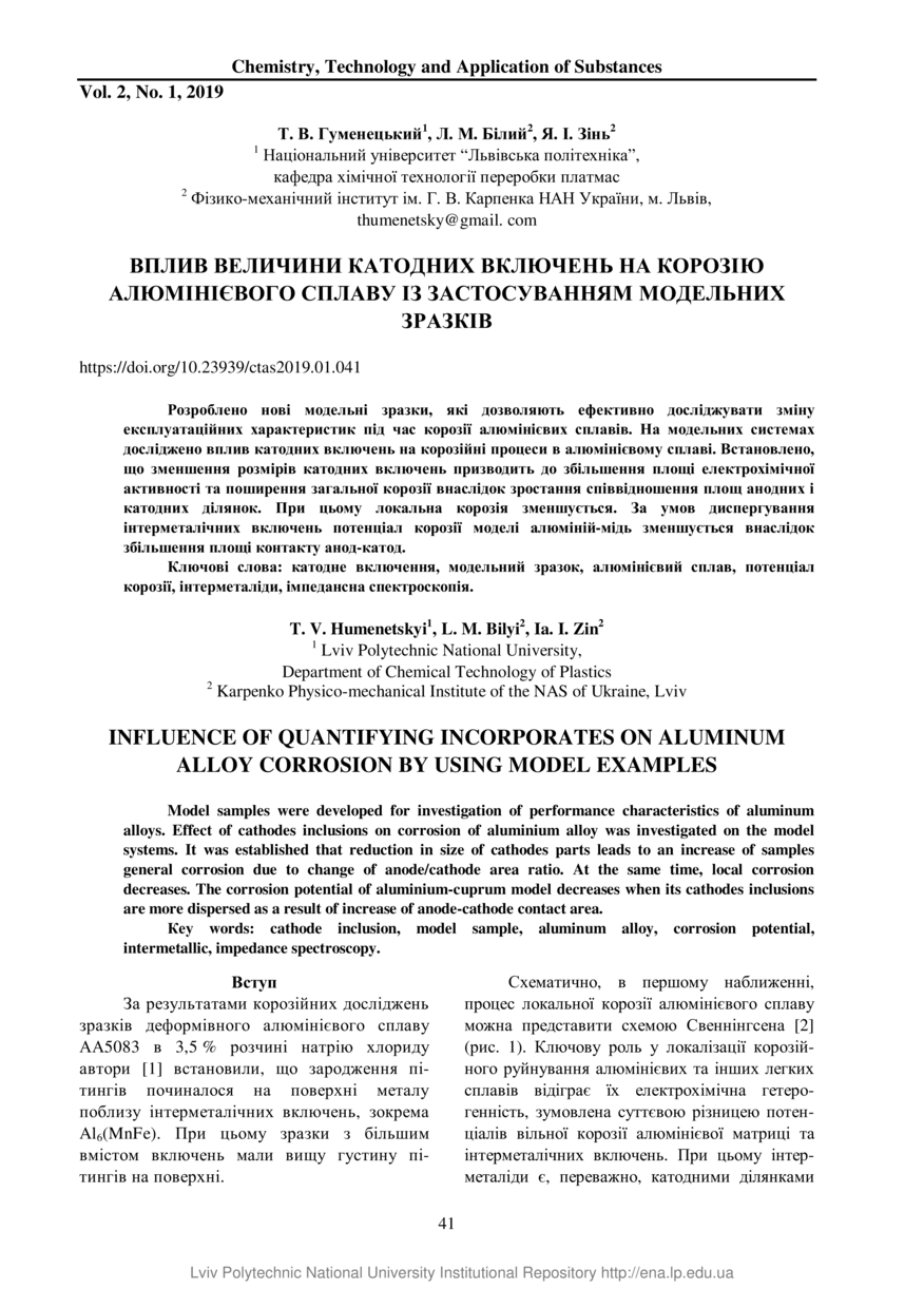 Гуменецький Т. В. Вплив величини катодних включень на корозію алюмінієвого сплаву із застосуванням модельних зразків / Т. В. Гуменецький, Л. М. Білий, Я. І. Зінь // Chemistry, Technology and Application of Substances. — Lviv : Lviv Politechnic Publishing House, 2019. — Том 2. — № 1. — С. 41–46.