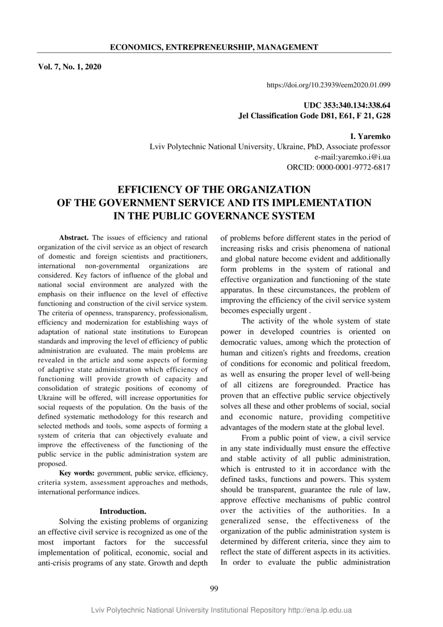 Yaremko I. Efficiency of the organization of the government service and its implementation in the public governance system / I. Yaremko // Economics, Entrepreneurship, Management. — Lviv : Lviv Politechnic Publishing House, 2020. — Vol 7. — No 1. — P. 99–106.