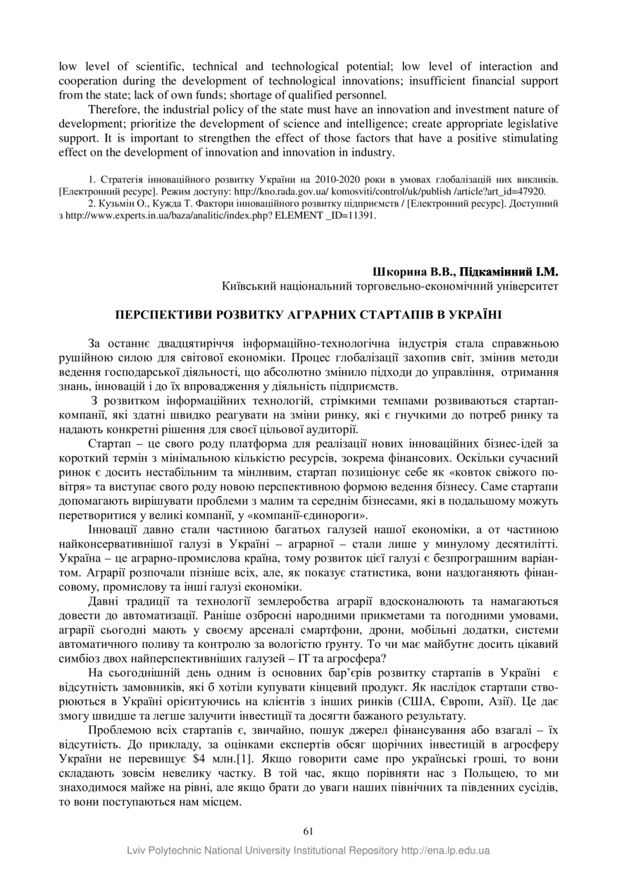 Шкорина В. В. Перспективи розвитку аграрних стартапів в Україні / В. В. Шкорина, І. М. Підкамінний // Управління інноваційним процесом в Україні: розвиток співпраці : тези доповідей VІІІ Міжнародної науково-практичної конференції, 18–20 червня 2020 року, Львів. — Львів : Видавництво Львівської політехніки, 2020. — С. 61–62. — (Інтеграція України у глобальний інноваційний простір).
