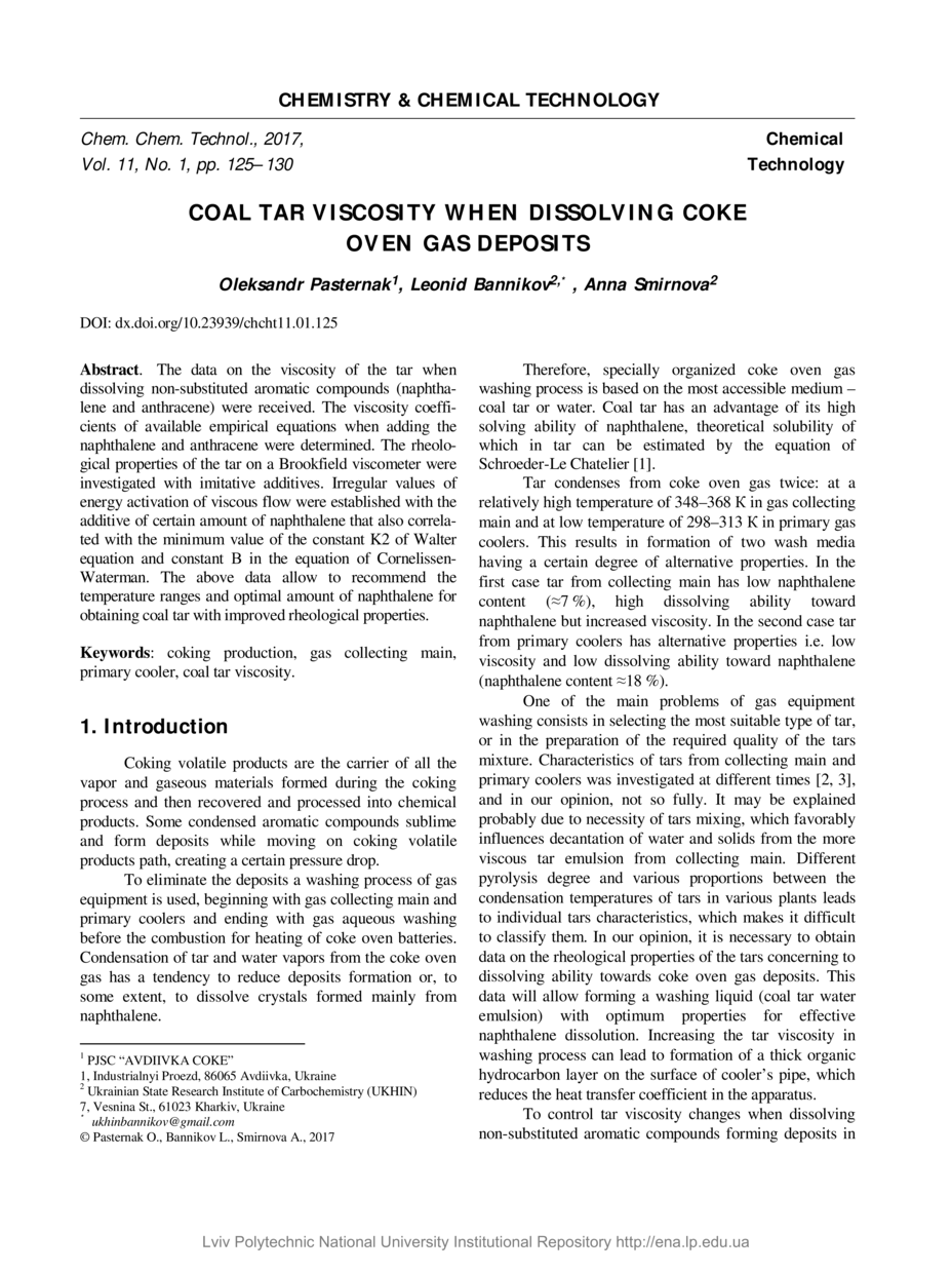 Pasternak O. Coal tar viscosity when dissolving coke oven gas deposits / Oleksandr Pasternak, Leonid Bannikov, Anna Smirnova // Chemistry & Chemical Technology. — Lviv : Lviv Politechnic Publishing House, 2017. — Vol 11. — No 1. — P. 125–130.