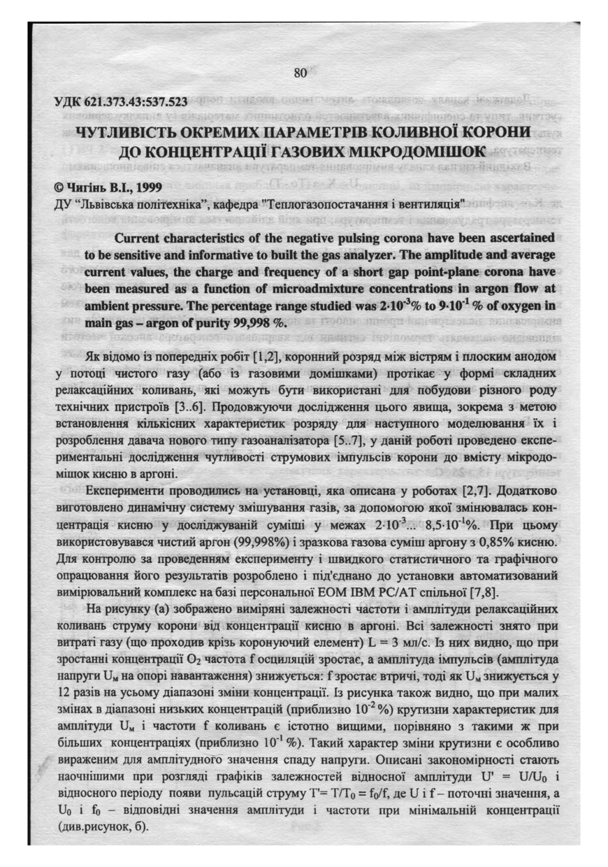 Чигінь В. І. Чутливість окремих параметрів коливної корони до концентрації газових мікродомішок / Чигінь В. І. // Вісник Державного університету «Львівська політехніка». Серія: Теплоенергетика. Інженерія довкілля. Автоматизація. — Львів : Видавництво Державного університету “Львівська політехніка”, 1999. — № 378. — С. 80–83. — (Теорія і техніка вимірювань).