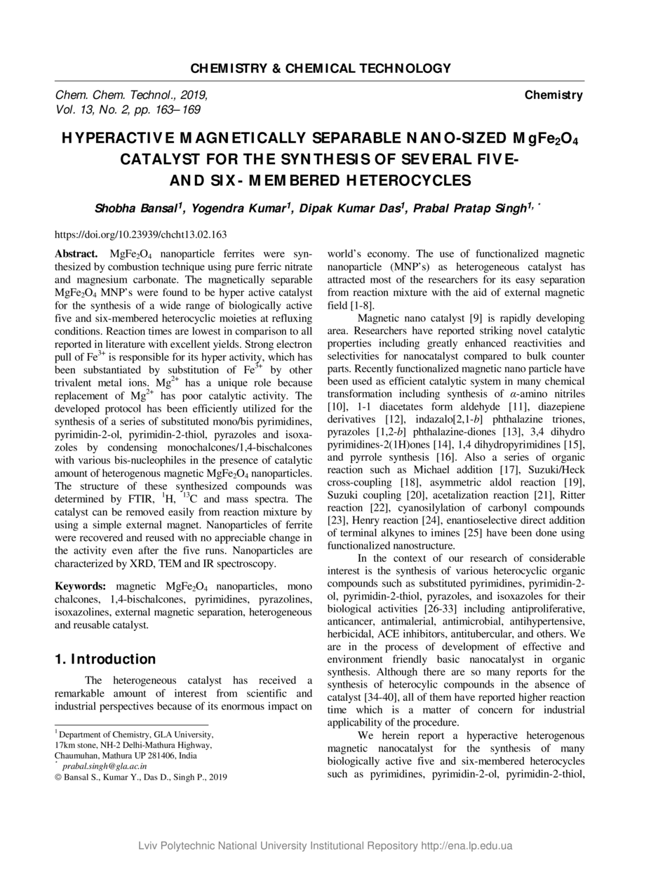 Hyperactive Magnetically Separable Nano-sized MgFe2O4 Catalyst for the Synthesis of Several Five- and Six-Membered Heterocycles / Shobha Bansal, Yogendra Kumar, Dipak Kumar Das, Prabal Pratap Singh // Chemistry & Chemical Technology. — Lviv : Lviv Politechnic Publishing House, 2019. — Vol 13. — No 2. — P. 163–169.