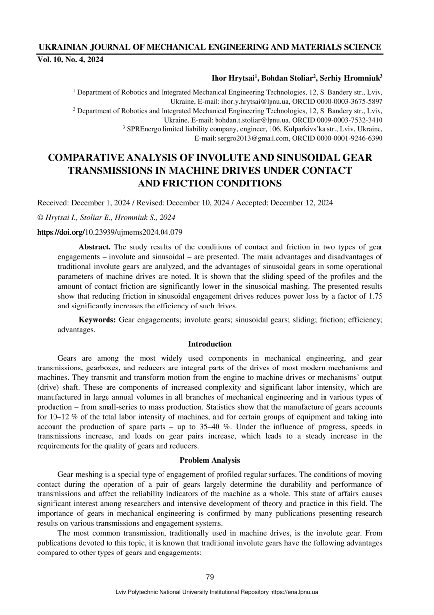 Hrytsai I. Comparative analysis of involute and sinusoidal gear transmissions in machine drives under contact and friction conditions / Hrytsai Ihor, Stoliar Bohdan, Hromniuk Serhiy // Ukrainian Journal of Mechanical Engineering and Materials Science. — Lviv : Lviv Politechnic Publishing House, 2024. — Vol 10. — No 4. — P. 79–85.