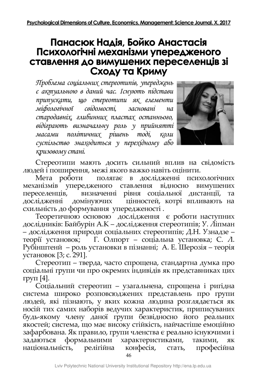 Панасюк Н. Психологічні механізми упередженого ставлення до вимушених переселенців зі Сходу та Криму / Надія Панасюк, Анастасія Бойко // Психологічні виміри культури, економіки, управління : науковий журнал. — Львів : ТзОВ «Ліга-Прес», 2017. — Том 10. — С. 46–50.