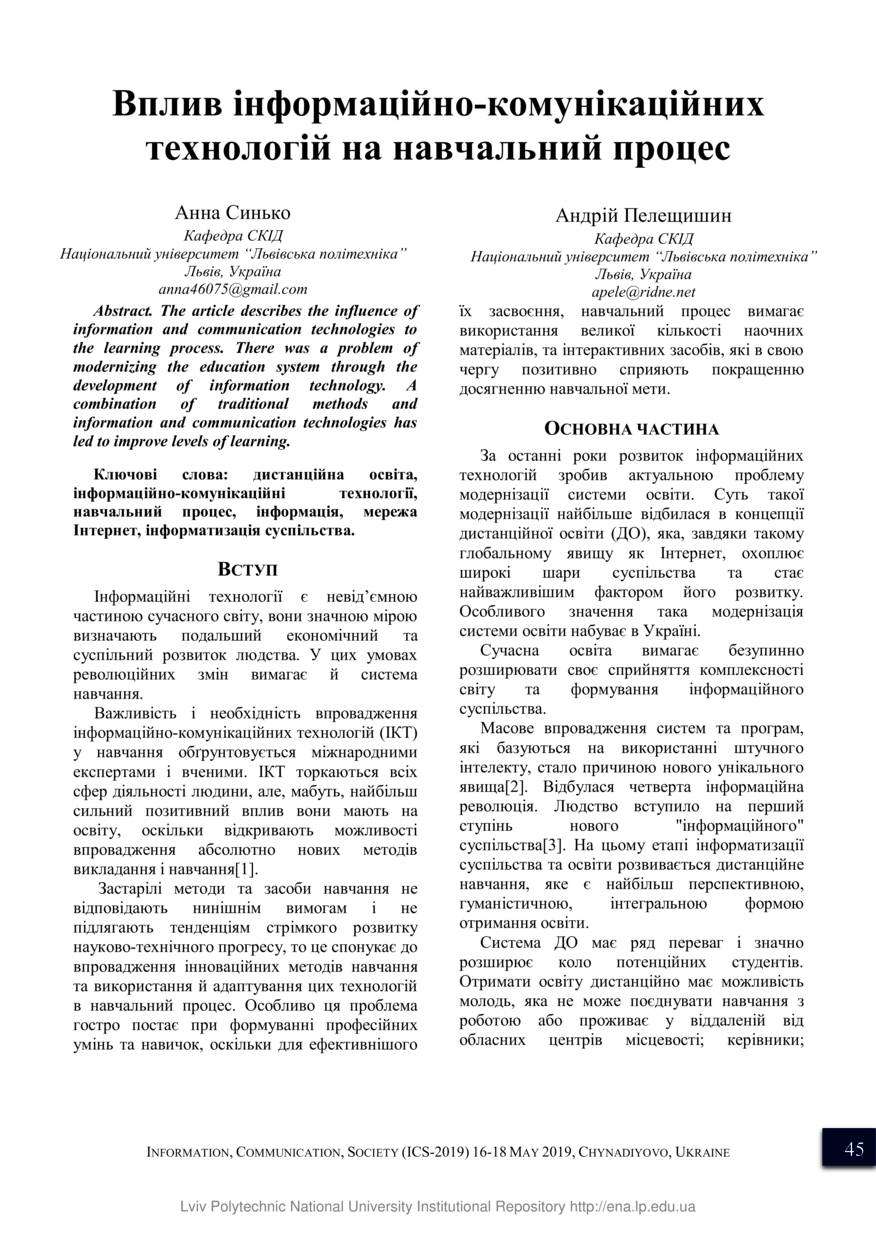 Синько А. Вплив інформаційно-комунікаційних технологій на навчальний процес / Анна Синько, Андрій Пелещишин // Інформація, комунікація, суспільство 2019 : матеріали 8-ої Міжнародної наукової конференції ІКС-2019, 16-18 травня 2019 року, Чинадієво. — Львів : Видавництво Львівської політехніки, 2019. — С. 45–46. — (Інформаційні та комунікаційні технології в Internet та World Wide Web).