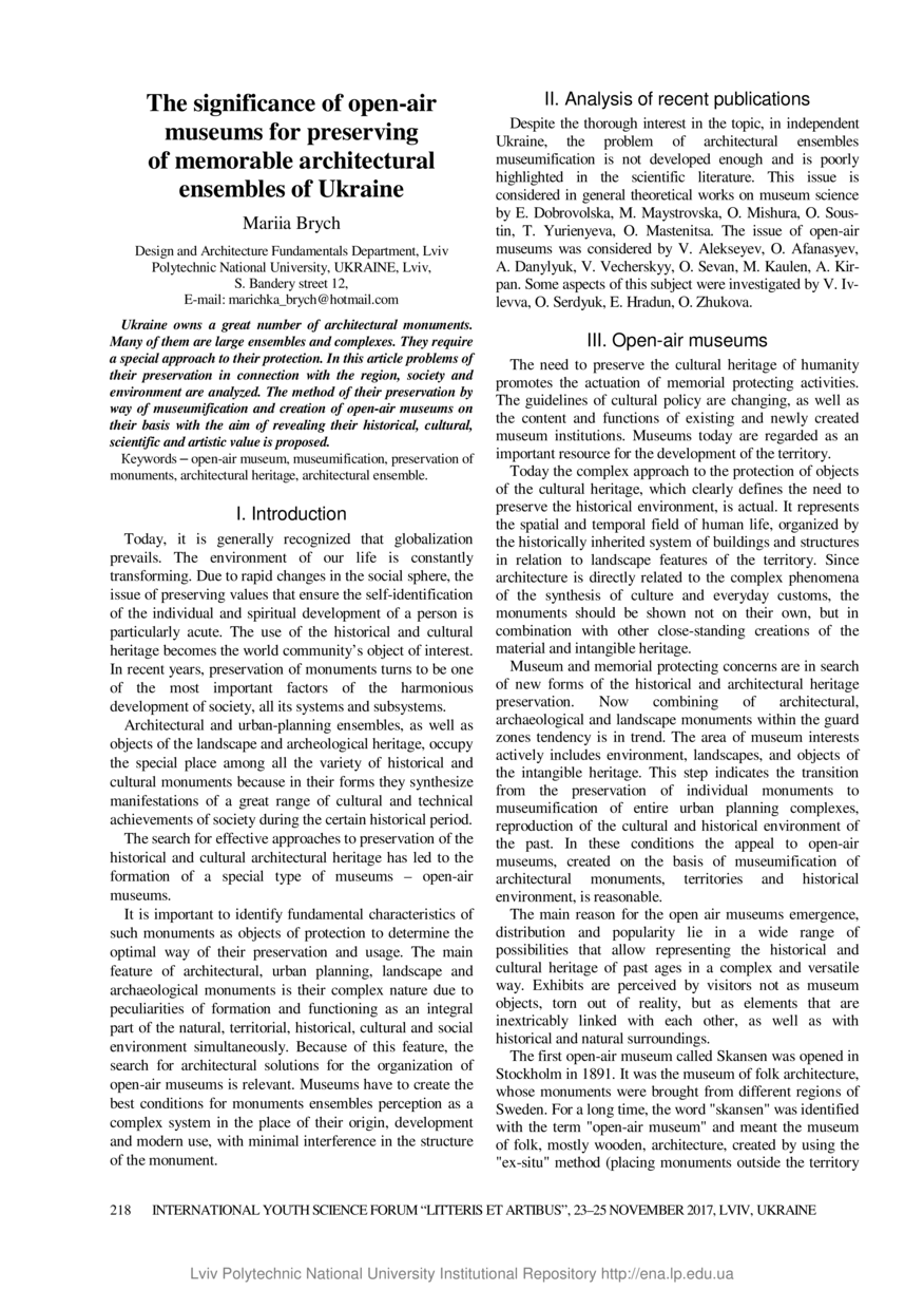 Brych M. The significance of open-air museums for preserving of memorable architectural ensembles of Ukraine / Mariia Brych // Litteris et Artibus : proceedings, 23–25 November, 2017. — Lviv : Lviv Polytechnic Publishing House, 2017. — P. 218–221. — (8th International academic conference «Geodesy, architecture & construction 2017» (GAC-2017)).