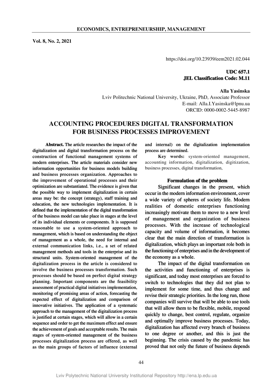 Yasinska A. Accounting procedures digital transformation for business processes improvement / A. Yasinska // Economics, Entrepreneurship, Management. — Lviv : Lviv Politechnic Publishing House, 2021. — Vol 8. — No 2. — P. 44–50.