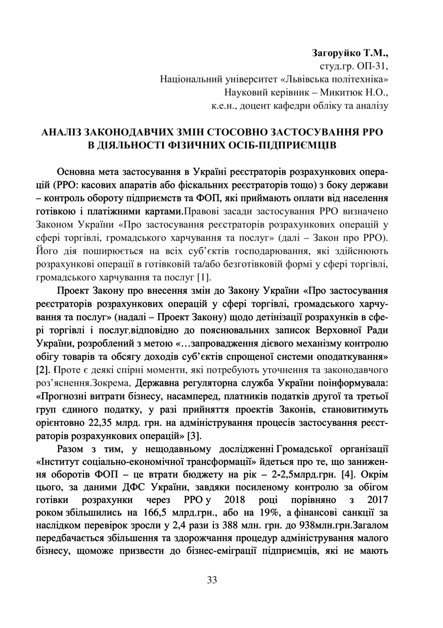 Загоруйко Т. М. Аналіз законодавчих змін стосовно застосування РРО в діяльності фізичних осіб-підприємців / Т. М. Загоруйко, Н. О. Микитюк // Облік, аналіз і контроль в управлінні суб’єктами економіки : тези доповідей V Міжнародної студентської наукової конференції, 18 жовтня 2019 року, Львів. — Львів : Видавництво Львівської політехніки, 2019. — С. 33–34. — (Актуальні проблеми бухгалтерського, управлінського та податкового обліку і шляхи їх вирішення).