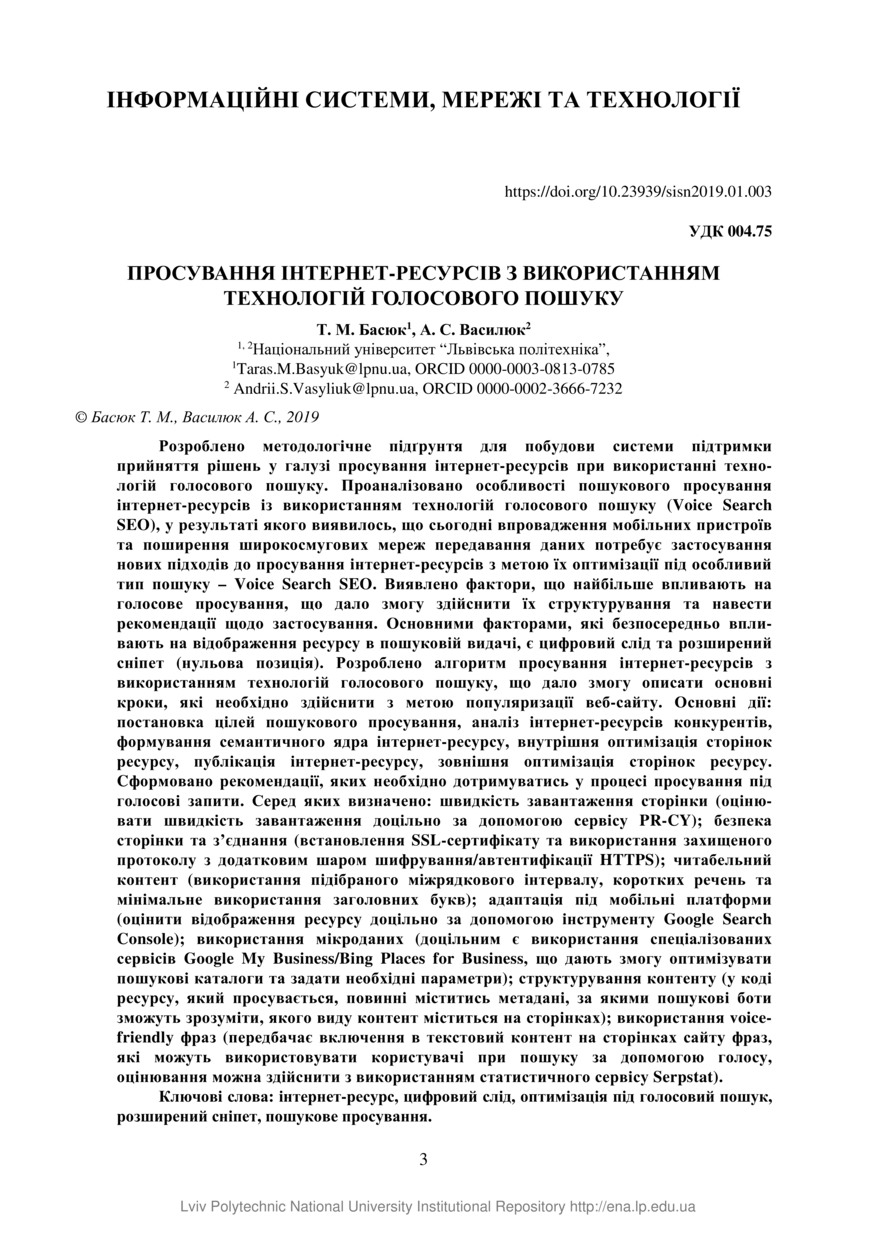 Басюк Т. М. Просування інтернет-ресурсів з використанням технологій голосового пошуку / Т. М. Басюк, А. С. Василюк // Вісник Національного університету "Львівська політехніка". Інформаційні системи та мережі. — Львів : Видавництво Львівської політехніки, 2019. — № 5. — С. 3–13.