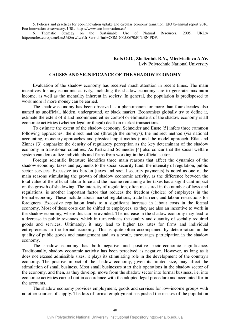 Kots O. O. Causes and significance of the shadow economy / O. O. Kots, R. Y. Zhelizniak, A. Ye. Miedviedieva // Управління інноваційним процесом в Україні: розвиток співпраці : тези доповідей VІІІ Міжнародної науково-практичної конференції, 18–20 червня 2020 року, Львів. — Львів : Видавництво Львівської політехніки, 2020. — С. 40–41. — (Інтеграція України у глобальний інноваційний простір).