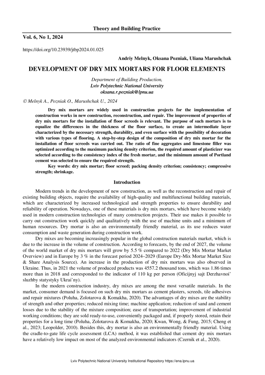 Melnyk A. Development of dry mix mortars for floor elements / Andriy Melnyk, Oksana Pozniak, Uliana Marushchak // Theory and Building Practice. — Lviv : Lviv Politechnic Publishing House, 2024. — Vol 6. — No 1. — P. 25–31.