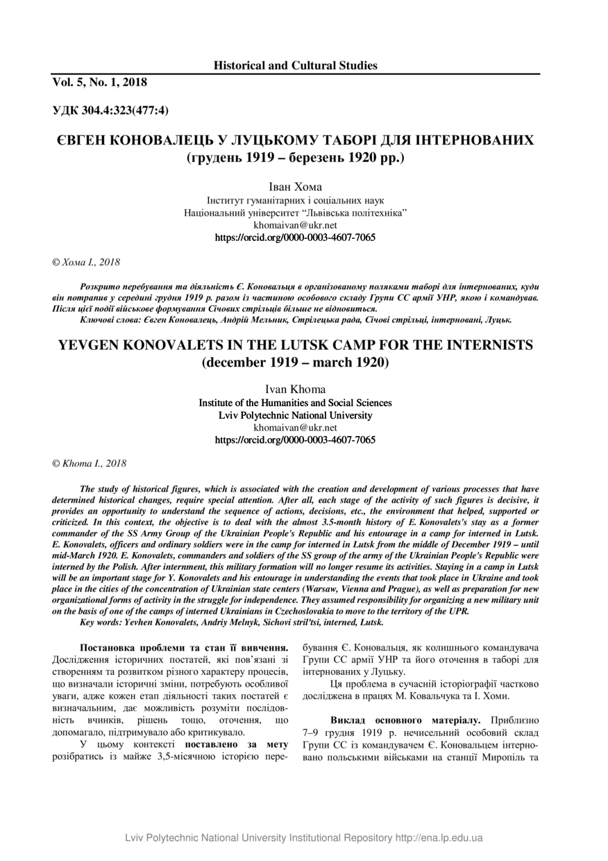 Хома І. Євген Коновалець у Луцькому таборі для інтернованих (грудень 1919 – березень 1920 рр.) / Іван Хома // Historical and Cultural Studies. — Lviv : Lviv Politechnic Publishing House, 2018. — Vol 5. — No 1. — P. 43–46.