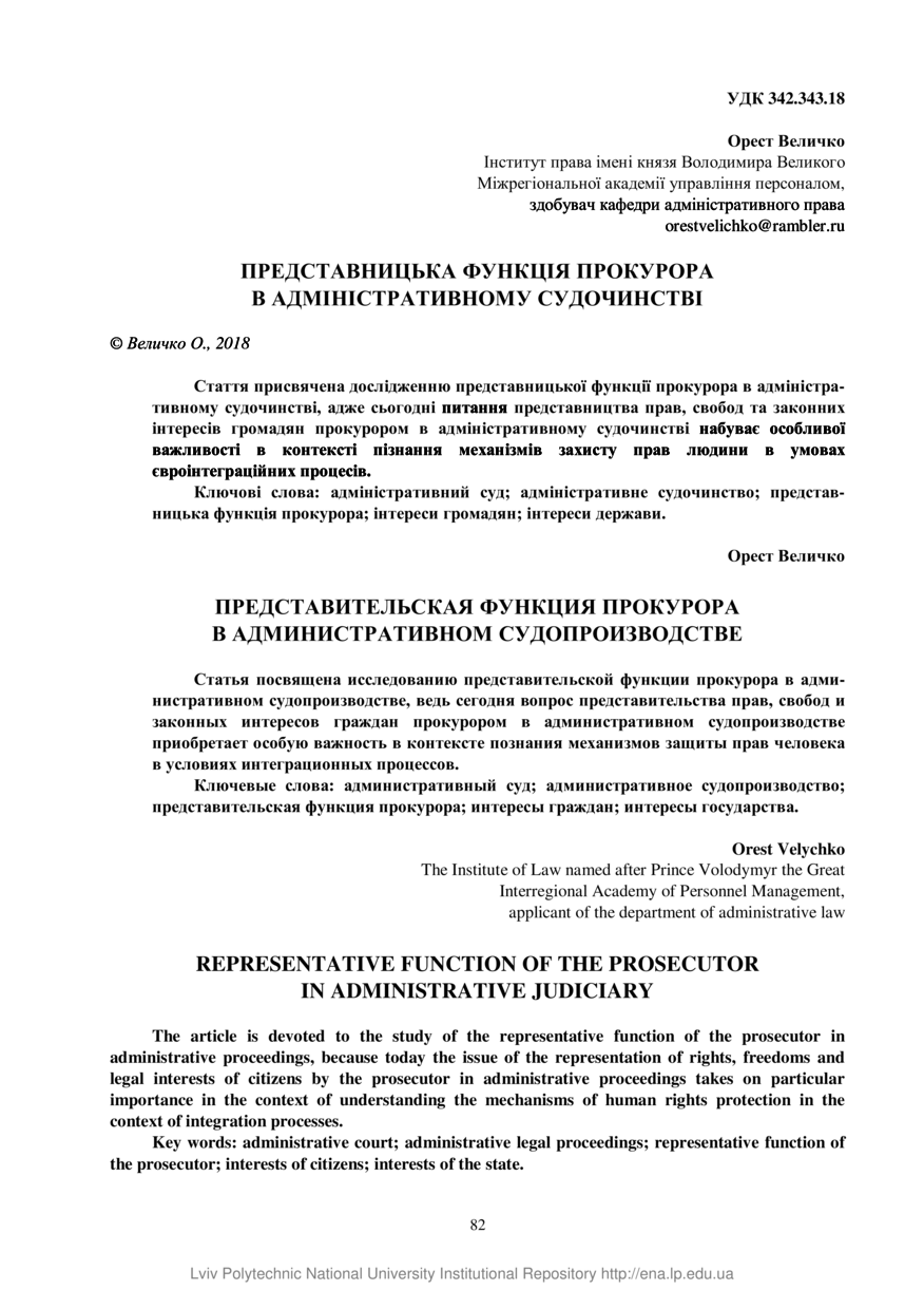 Величко О. Представницька функція прокурора в адміністративному судочинстві / Орест Величко // Вісник Національного університету “Львівська політехніка”. Серія: Юридичні науки. — Львів : Видавництво Львівської політехніки, 2018. — № 902 (19). — С. 82–87.