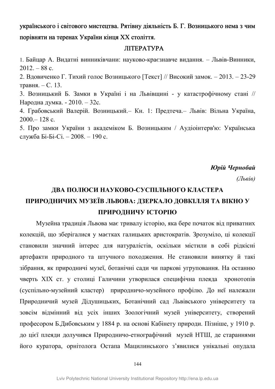 | dc.identifier.citationen | Chernobai Iu. Dva poliusy naukovo-suspilnoho klastera pryrodnychykh muzeiv Lvova: dzerkalo dovkillia ta vikno u pryrodnychu istoriiu / Yurii Chernobai // Istoryko-kulturna spadshchyna: yevropeiskyi vymir : tezy Vseukrainskoi naukovo-praktychnoi konferentsii, 1 chervnia, 2018 roku, Lviv. — Lviv : Interprint, 2018. — P. 144–149. | |