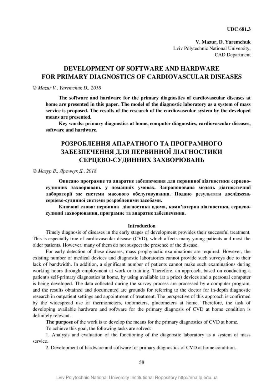 Mazur V. Development of software and hardware for primary diagnostics of cardiovascular diseases / V. Mazur, D. Yaremchuk // Вісник Національного університету “Львівська політехніка”. Серія: Комп’ютерні системи проектування теорія і практика. — Львів : Видавництво Львівської політехніки, 2018. — № 908. — С. 58–64.