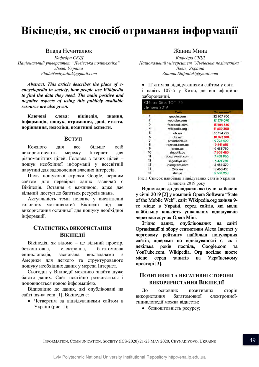 Нечиталюк В. Вікіпедія, як спосіб отримання інформації / Влада Нечиталюк, Жанна Мина // Інформація, комунікація, суспільство 2020 : матеріали 9-ї Міжнародної наукової конференції, 21–23 травня 2020 року, Львів. — Львів : Видавництво Львівської політехніки, 2020. — С. 49–50. — (Інформаційні та комунікаційні технології в Internet та World Wide Web).