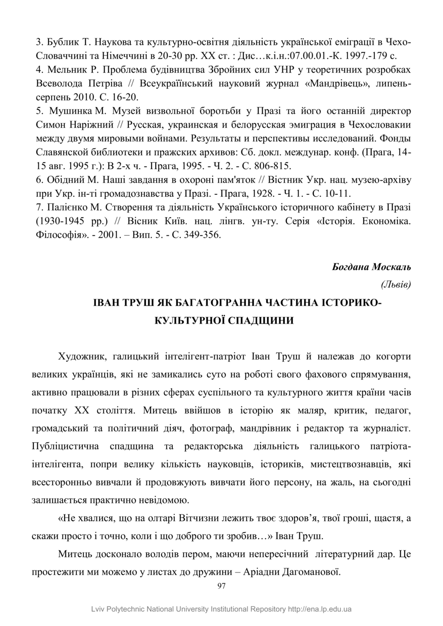 Москаль Б. Іван Труш як багатогранна частина історико-культурної спадщини / Богдана Москаль // Історико-культурна спадщина: європейський вимір : тези Всеукраїнської науково-практичної конференції, 1 червня, 2018 року, Львів. — Львів : Інтерпрінт, 2018. — С. 97–100.
