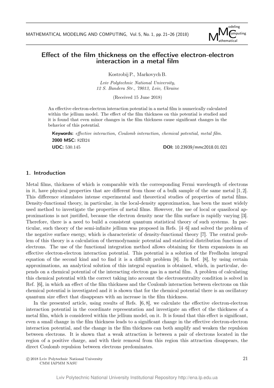 Kostrobij P. Effect of the film thickness on the effective electron-electron interaction in a metal film / P. Kostrobij, B. Markovych // Mathematical Modeling and Computing. — Lviv : Lviv Politechnic Publishing House, 2018. — Vol 5. — No 1. — P. 21–26.