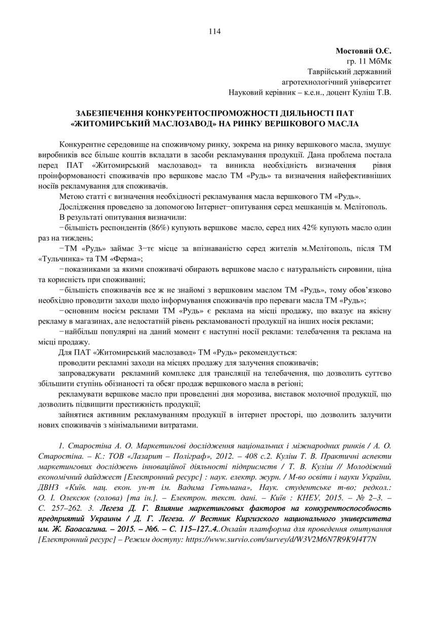 Мостовий О. Є. Забезпечення конкурентоспроможності діяльності ПАТ «Житомирський маслозавод» на ринку вершкового масла / О. Є. Мостовий, Т. В. Куліш // Цілі сталого розвитку у вітчизняних реаліях: студентський погляд на проблему : тези доповідей ІІІ Всеукраїнської студентської науково-практичної конференції, 19–20 квітня 2018 року, Львів. — Львів : Видавництво Львівської політехніки, 2018. — С. 114. — (Економіка: ефективність, раціональність, безпечність).