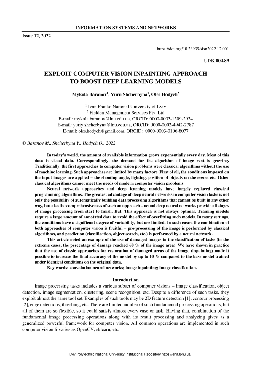 Baranov M. Exploit computer vision inpainting approach to boost deep learning models / Baranov Mykola, Shcherbyna Yurii, Hodych Oles // Вісник Національного університету "Львівська політехніка" "Інформаційні системи та мережі". — Lviv : Lviv Politechnic Publishing House, 2022. — No 12. — P. 1–6.