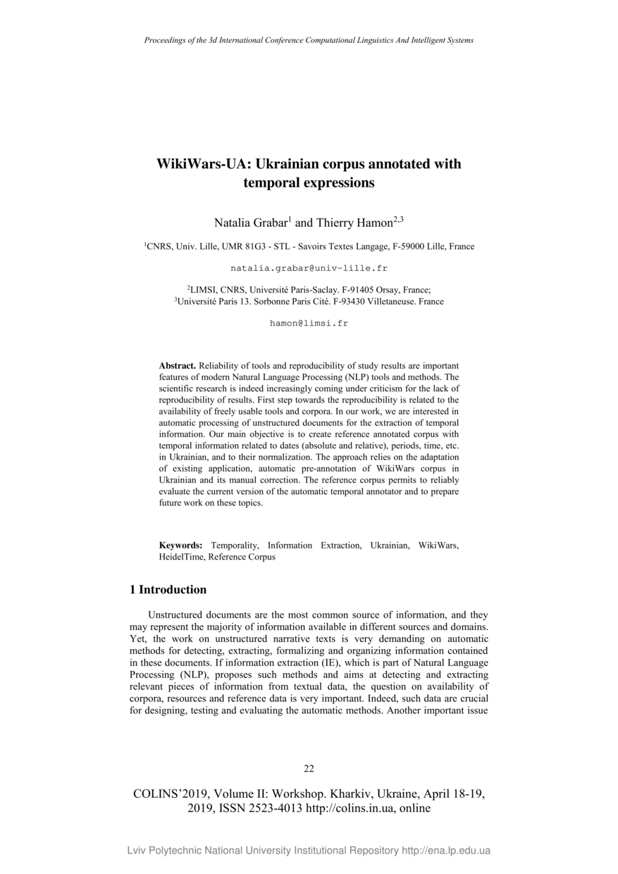 Grabar N. WikiWars-UA: Ukrainian corpus annotated with temporal expressions / Natalia Grabar, Thierry Hamon // Computational Linguistics and Intelligent Systems. — Lviv : Lviv Politechnic Publishing House, 2019. — Vol 2 : Proceedings of the 3nd International conference, COLINS 2019. Workshop, Kharkiv, Ukraine, April 18-19, 2019. — P. 22–31. — (Paper presentations).