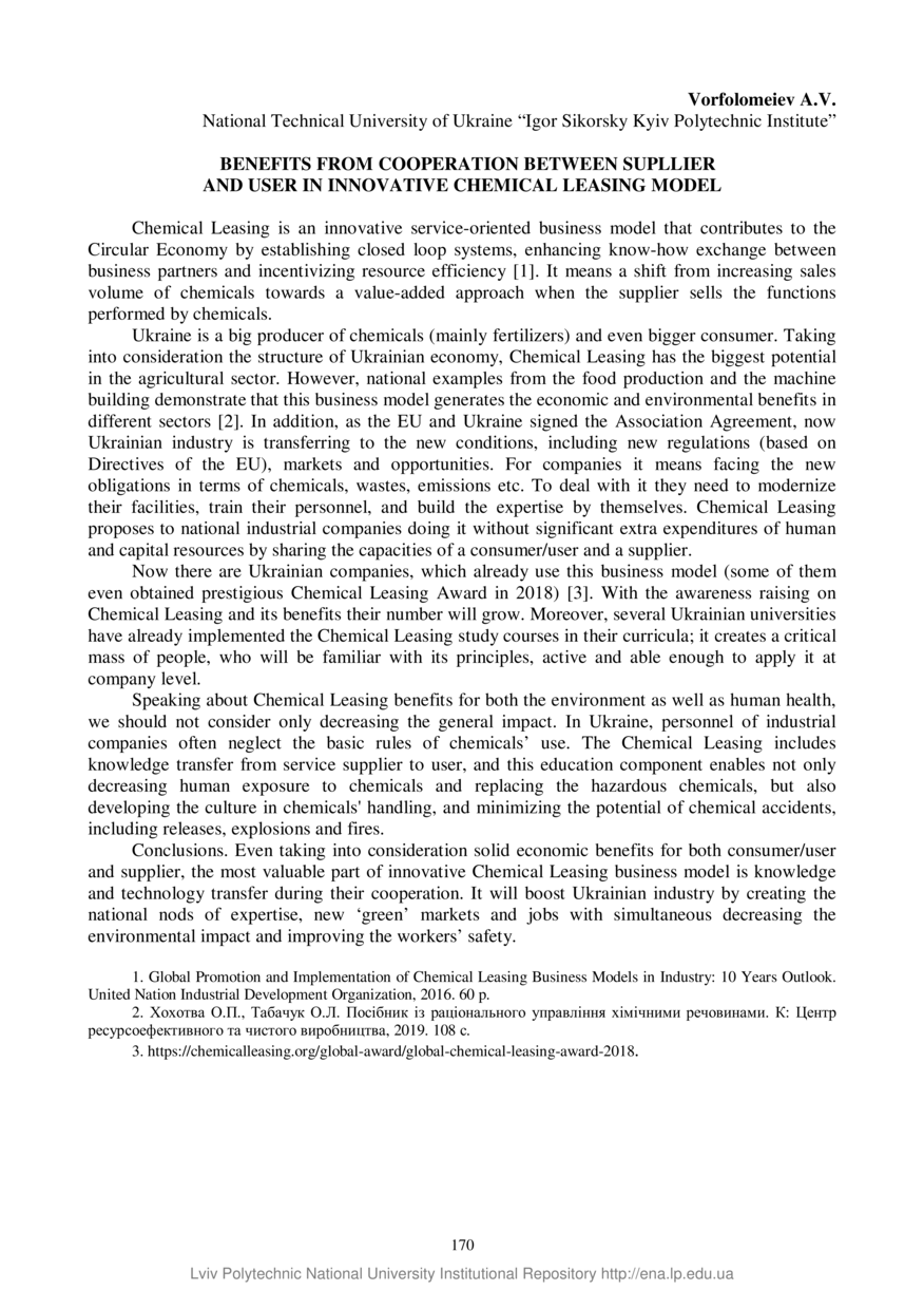 | dc.relation.referencesen | 1. Global Promotion and Implementation of Chemical Leasing Business Models in Industry: 10 Years Outlook. United Nation Industrial Development Organization, 2016. 60 p. | |