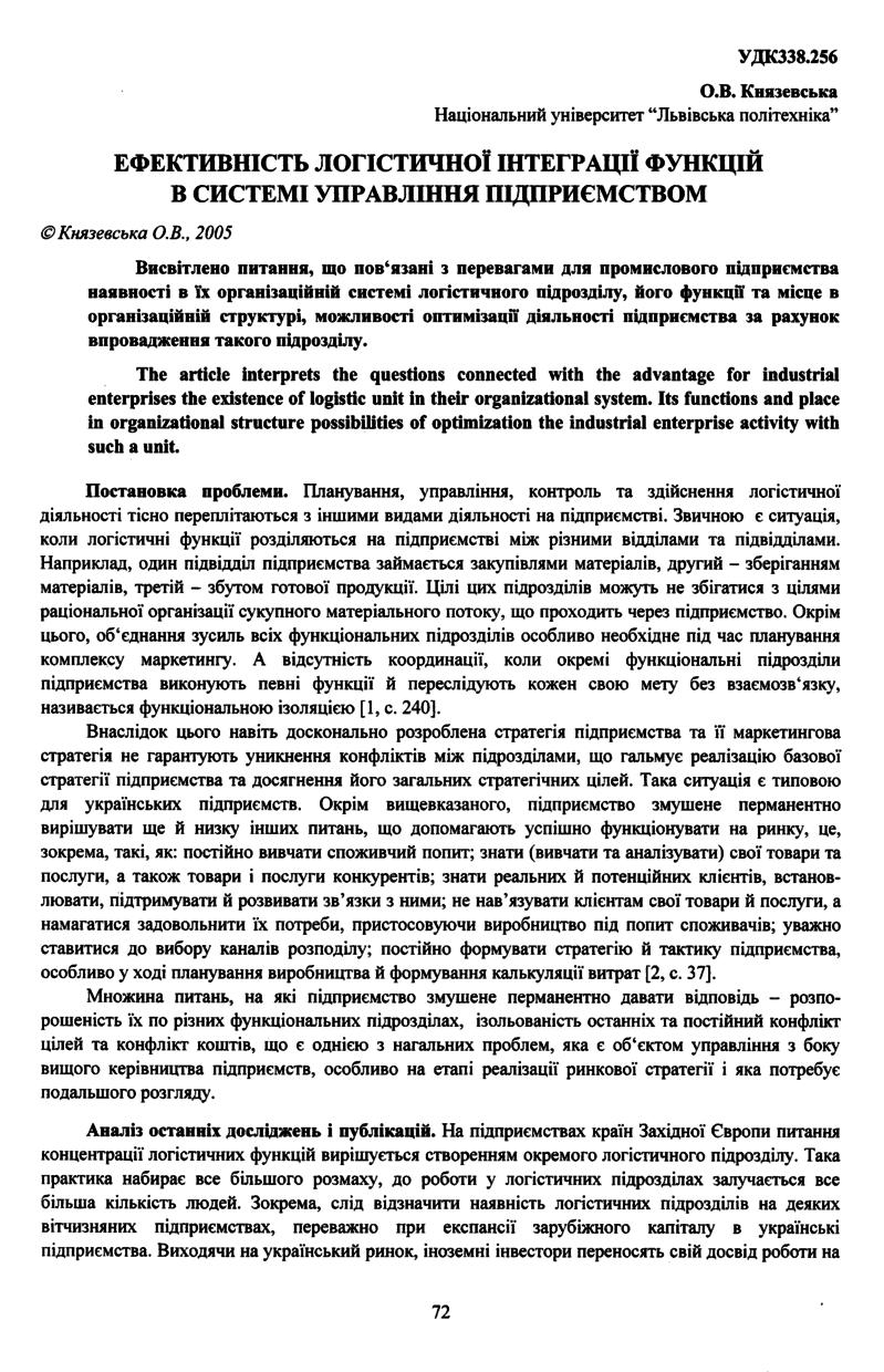 Ефективність логістичної інтеграції функцій в системі управління підприємством