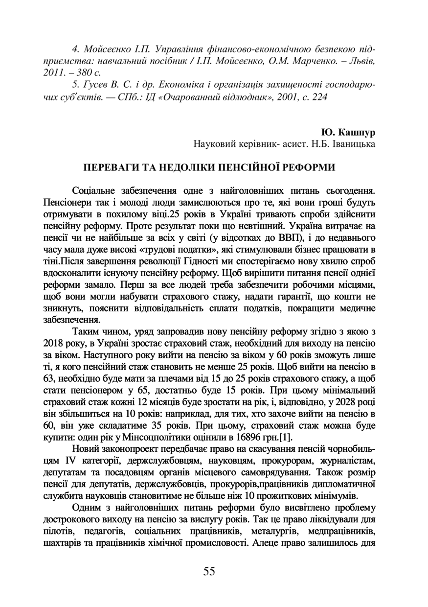 Кашпур Ю. Переваги та недоліки пенсійної реформи / Ю. Кашпур, Н. Б. Іваницька // 76-та Студентська науково-технічна конференція. Секція "Публічне управління та адміністрування" : збірник тез доповідей, 7 листопада 2018 року, Львів. — Львів : Видавництво Львівської політехніки, 2018. — С. 55–56.