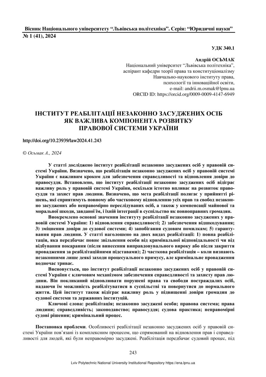 | dc.identifier.citationen | Osmak A. Institute of rehabilitation of illegally convicted persons as an important component of the development of the legal system of Ukraine / Osmak Andrii // Bulletin of Lviv Polytechnic National University. Series: Legal Sciences. — Lviv : Lviv Politechnic Publishing House, 2024. — No 1(41). — P. 243–248. | |