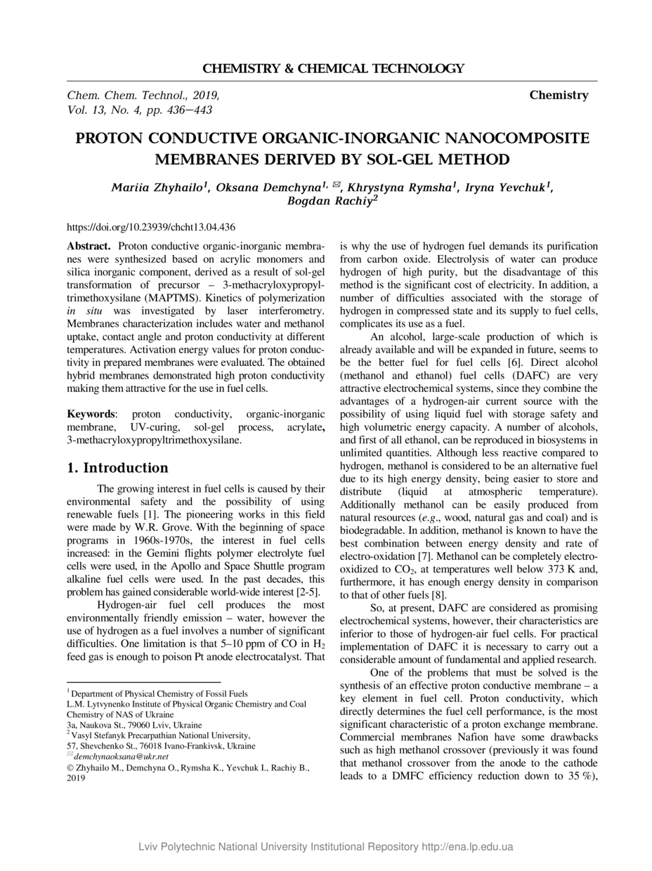Proton Conductive Organic-Inorganic Nanocomposite Membranes Derived by Sol-Gel Method / Mariia Zhyhailo, Oksana Demchyna, Khrystyna Rymsha, Iryna Yevchuk, Bogdan Rachiy // Chemistry & Chemical Technology. — Lviv : Lviv Politechnic Publishing House, 2019. — Vol 13. — No 4. — P. 436–443.