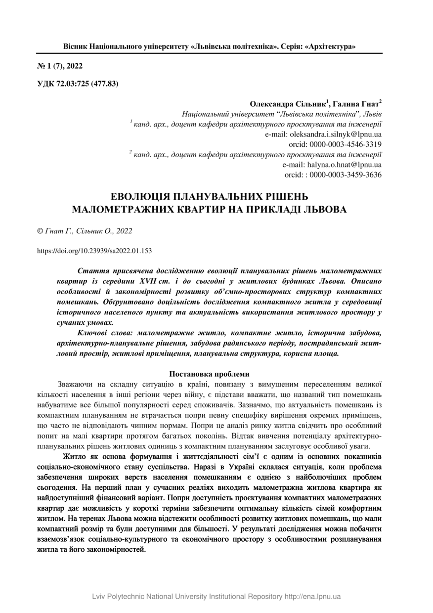 Сільник О. Еволюція планувальних рішень малометражних квартир на прикладі Львова / Олександра Сільник, Галина Гнат // Вісник Національного університету “Львівська політехніка”. Серія: Архітектура. — Львів : Видавництво Львівської політехніки, 2022. — Том 4 (1). — № 1 (7). — С. 153–161.