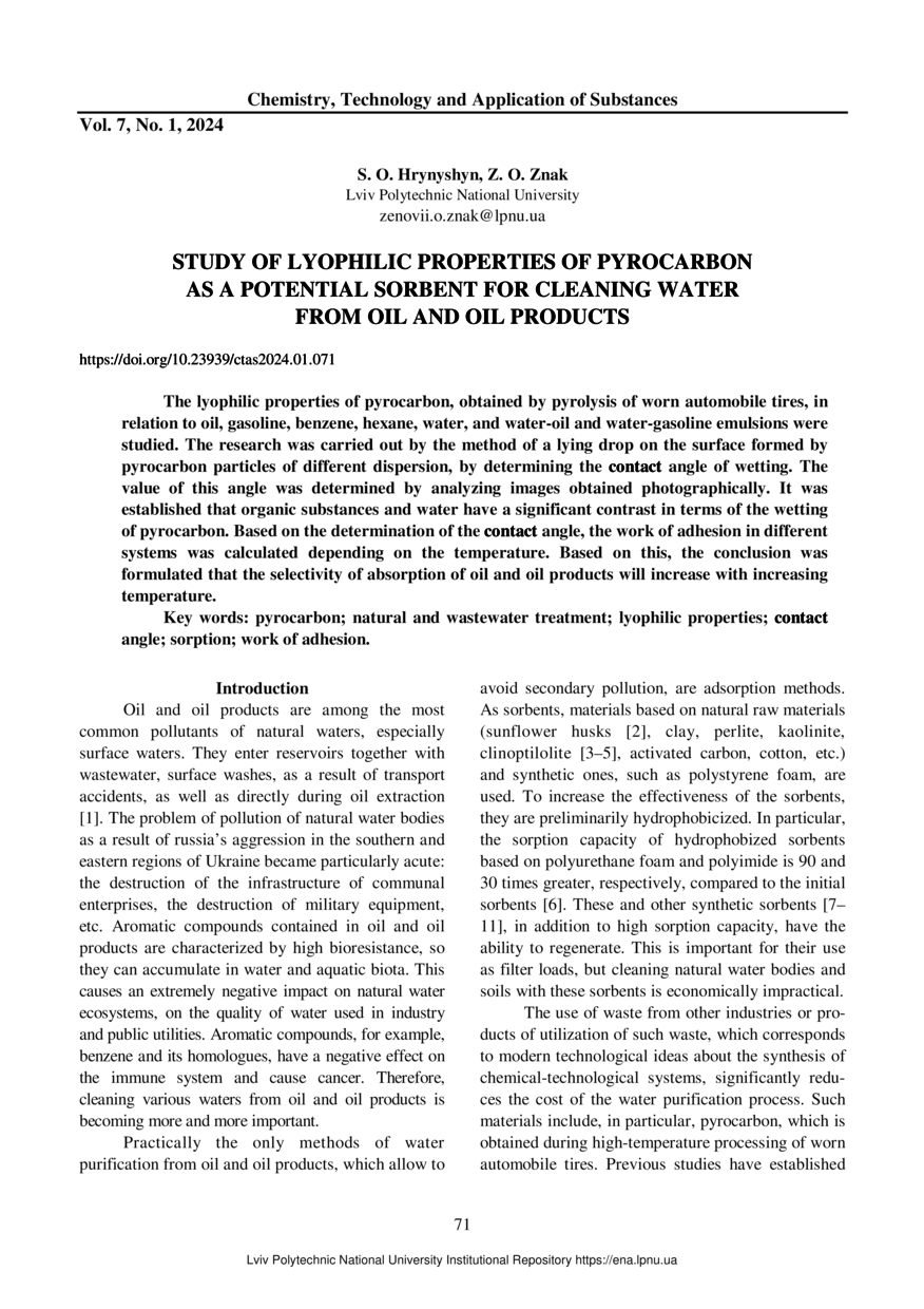 Hrynyshyn S. O. Study of lyophilic properties of pyrocarbon as a potential sorbent for cleaning water from oil and oil products / S. O. Hrynyshyn, Z. O. Znak // Chemistry, Technology and Application of Substances. — Lviv : Lviv Politechnic Publishing House, 2024. — Vol 1. — No 7. — P. 71–77.