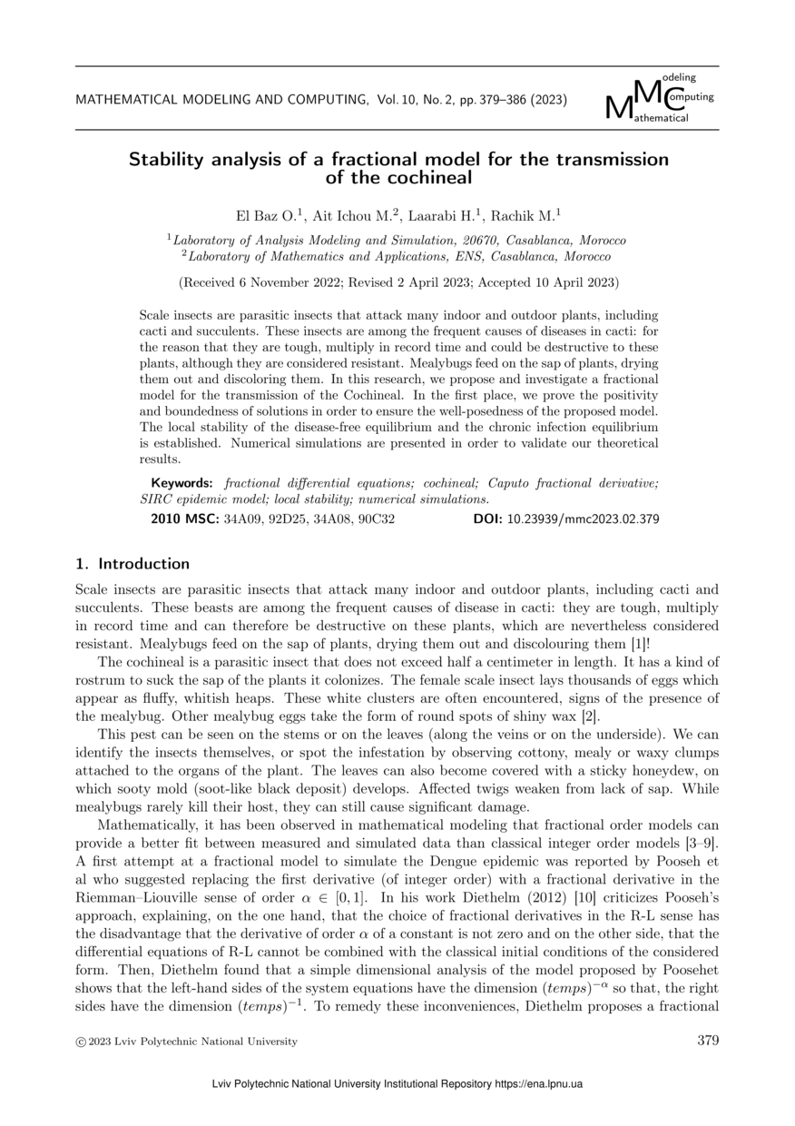 Stability analysis of a fractional model for the transmission of the cochineal / O. El Baz, M. Ait Ichou, H. Laarabi, M. Rachik // Mathematical Modeling and Computing. — Lviv : Lviv Politechnic Publishing House, 2023. — Vol 10. — No 2. — P. 379–386.